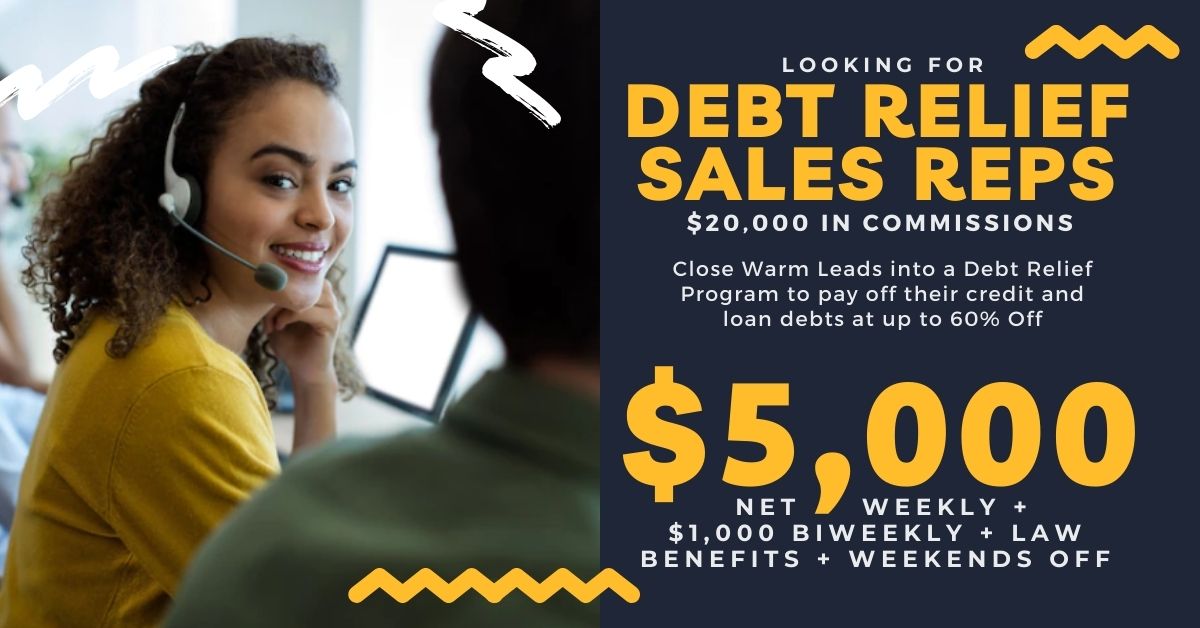 $5,000 Net Weekly Pay + $1,000 Biweekly Bonus + $20,000 in Commissions + Law Benefits as a Debt Relief Sales from Monday to Friday with Weekends Off.